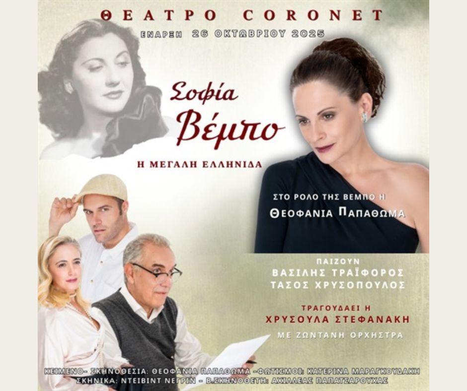 Κυριακή 30 Νοεμβρίου 2025 πάμε Θέατρο Coronet ΣΟΦΙΑ ΒΕΜΠΟ - "Η ΜΕΓΑΛΗ ΕΛΛΗΝΙΔΑ" Μια μουσικοθεατρική παράσταση που αναβιώνει τη ζωή και τα τραγούδια της Σοφίας Βέμπο. Η μεγάλη Ελληνίδα, «Η […]
